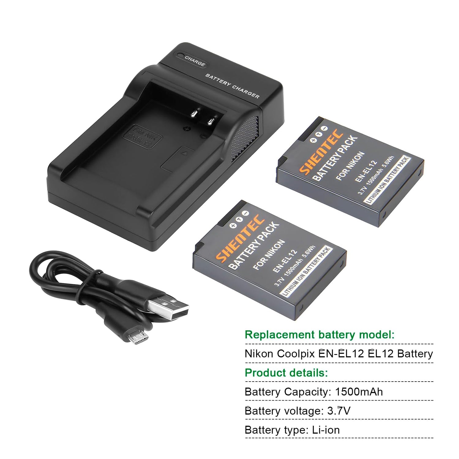 • Type: Li-ion Voltage: 3.7V. Capacity: 1500 mAh. Replacement batteries for Nikon Coolpix EN-EL12, EL12, 100% compatible.